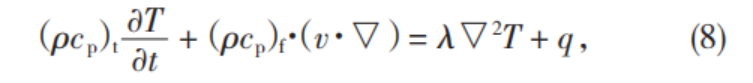 式(6)—式(7)中,ρ為密度,kg/m3;cp為比熱容,J(/kg·K);(ρcp)f為多孔介質(zhì)流相中總的體積比熱容,J/m3;T為溫度,K;t為時間,s;λf為液體導(dǎo)熱系數(shù),W(/m·K);qf為液體內(nèi)熱源強度,W;(ρcp)s為多孔介質(zhì)固相中總的體積比熱容,J/m3。將式(6)與式(7)相加,可導(dǎo)出單相流體的多孔介質(zhì)的能量方程為: