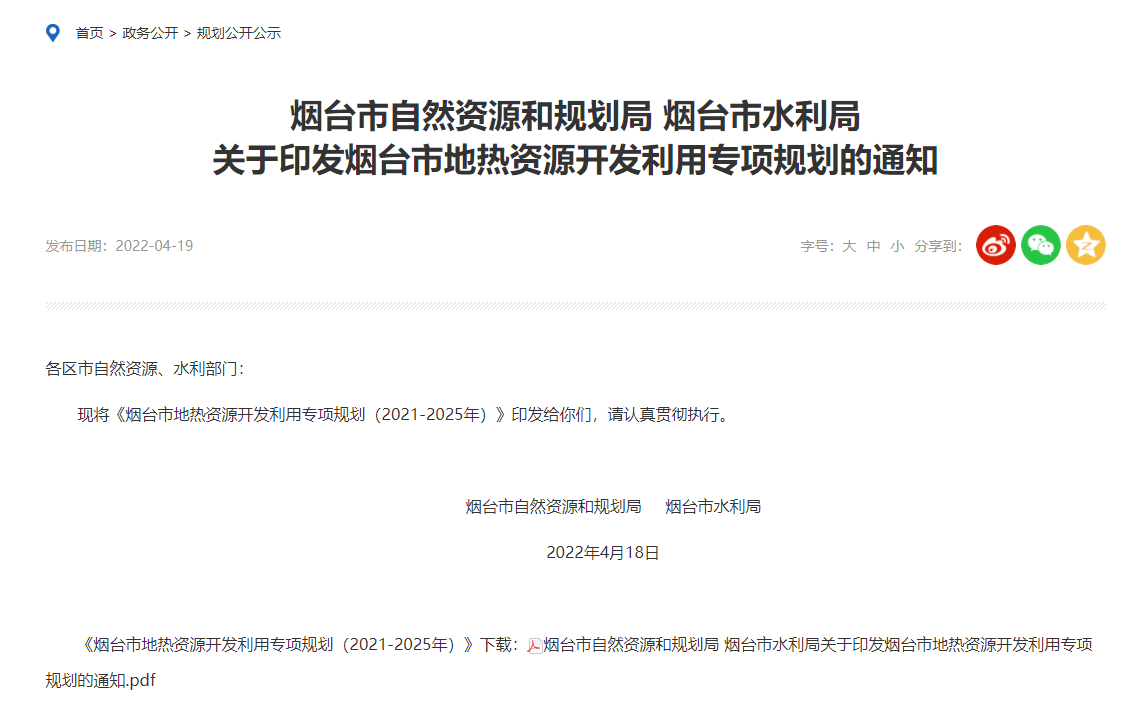 地大熱能地?zé)?多能互補新聞網(wǎng)訊:近日,煙臺市自然資源和規(guī)劃局、煙臺市水利局聯(lián)合印發(fā)了《煙臺市地?zé)豳Y源開發(fā)利用專項規(guī)劃(2021-2025年)》(以下簡稱《規(guī)劃》)。