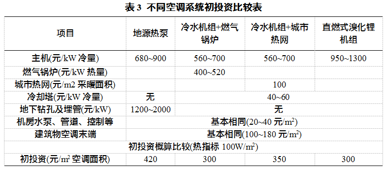 不同空調(diào)系統(tǒng)初投資比較如表3所示。