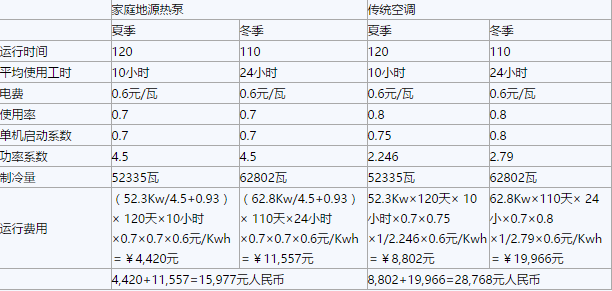 由于地表層的這種特性,從而保證了家庭地源熱泵的高效性和經(jīng)濟(jì)性。在制熱制冷時(shí),家庭地源熱泵能夠?qū)⑼寥赖臏囟劝岬绞覂?nèi),其能量70%來(lái)自土壤,能效比高達(dá)4.2—5.3,輸入1KW的電量可以得到5KW以上的制冷制熱量。接下來(lái)就來(lái)為大家介紹下家庭地源熱泵與傳統(tǒng)空調(diào)的費(fèi)用比較:
