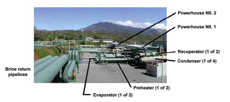 米拉瓦列斯的五號發(fā)電機組是2004年剛投入使用的。這個發(fā)電機利用從一號和二號和三號發(fā)電機組中的廢棄鹵水,通過注入井來獲取了可能回到熱儲層中的能量。總共的發(fā)電量是15.5MW,發(fā)電機組中的每一個發(fā)電單元都發(fā)出7.75MW的電。每一個發(fā)電單元是有兩個渦輪組成的,驅(qū)動同一個發(fā)電機。循環(huán)工質(zhì)是常規(guī)的正戊烷,C5H12。每一個單元用兩個預(yù)熱器。兩個蒸發(fā)器跟他們各自的分隔板。兩個回?zé)崞?,四個水冷凝器。這個發(fā)電機組是有澳瑪特(Ormat)提供的。