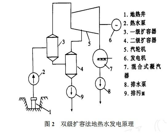 西南電力設(shè)計(jì)院設(shè)計(jì)的羊八井地?zé)?/a>電站第1臺(tái)試驗(yàn)機(jī)組,容量為1000kW,汽輪機(jī)是利用四川內(nèi)江電廠2500kW廢棄設(shè)備改造而成。于1977年10月試運(yùn)成功,采用單級(jí)擴(kuò)容法熱力系統(tǒng)。若把地?zé)崴?/a>送入1個(gè)密閉的容器中降壓、擴(kuò)容,根據(jù)水沸點(diǎn)與壓力的關(guān)系,可使溫度不太高的地?zé)?/a>水因氣壓降低而沸騰變成蒸汽。由于地?zé)?/a>水降壓蒸發(fā)的速度很快,是一種閃急蒸發(fā)過程;同時(shí),地?zé)崴?/a>蒸發(fā)產(chǎn)生蒸汽時(shí),其體積迅速擴(kuò)大,所以該容器稱為“擴(kuò)容器”或“閃蒸器”。用這種方法產(chǎn)生蒸汽來發(fā)電稱為擴(kuò)容法地?zé)崴?/a>發(fā)電。這是利用地?zé)崽?/a>熱水發(fā)電的主要方式之一,該方式分單級(jí)擴(kuò)容法系統(tǒng)和雙級(jí)(或多級(jí))擴(kuò)容法系統(tǒng)。擴(kuò)容法系統(tǒng)的原理是:將地?zé)峋?/a>來的中溫地?zé)?/a>汽、水混合物,先送到擴(kuò)容器中進(jìn)行降壓、擴(kuò)容(稱閃蒸),使其產(chǎn)生部分蒸汽,蒸汽經(jīng)過分離器除去雜質(zhì)(10μm及以上)后,再引到常規(guī)汽輪機(jī)機(jī)發(fā)電。