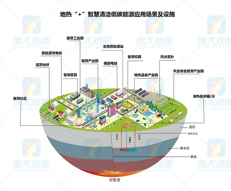 地熱+(風能、太陽能、氫能、儲能、水能、生物質能等)新能源,根據(jù)因地制宜、多能互補實現(xiàn)能源綜合開發(fā)利用。